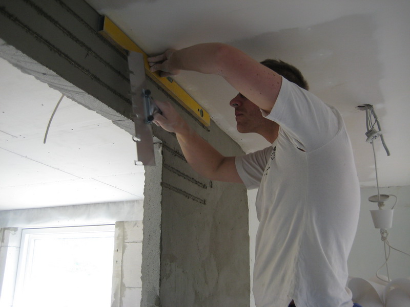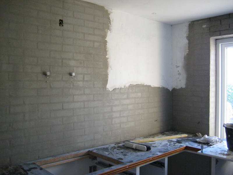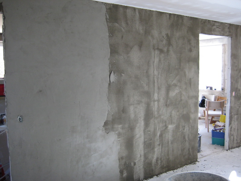 Her ses væggen med spartel og væv !1. Vi startede med en rå mur som vi spartlede for at få en nogenlunde jævn overflade, grunden til dette er at vi ønsker at armere væggen med glasvæv da væggen ikke er mere end 7,5 cm tyk. Vi synes væggenvar for svag, så derfor har vi valgt at gøre det sådan.